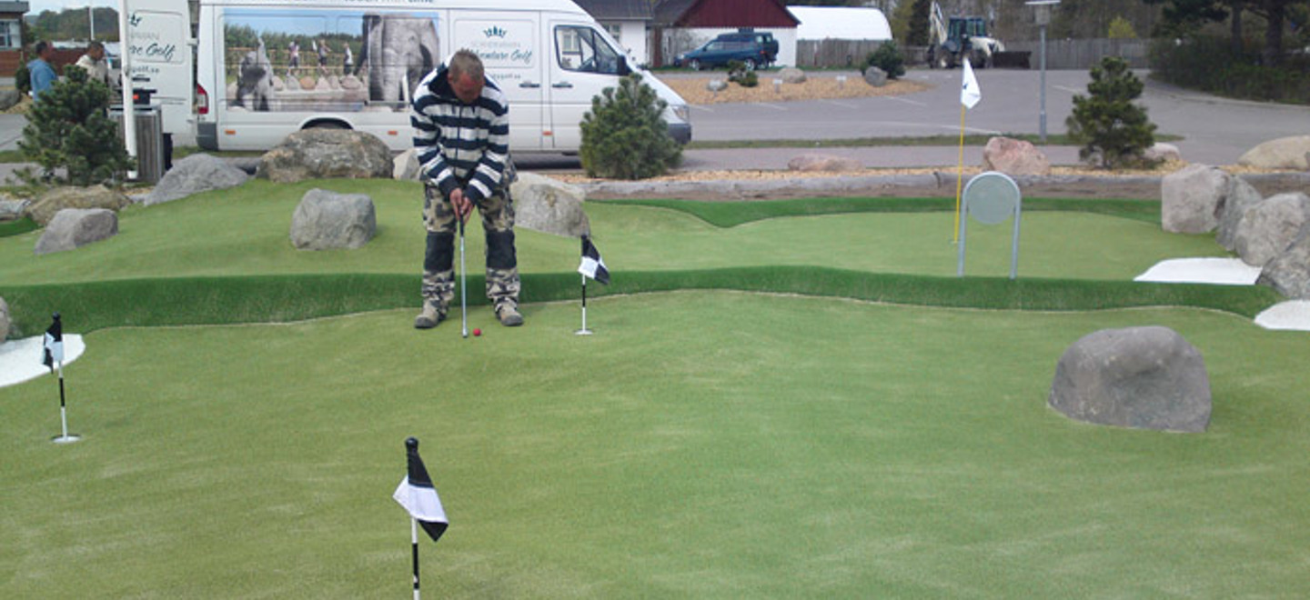 Die Anlage bietet mehrere spannende Hindernisse und zudem ein Putting Green, auf dem die Spieler sich im Putten üben können, bevor sie auf dem Platz den Wettkampf um ein Eis antreten – oder darum, wer am Abend in der modernen Campinghütte den Abwasch macht.