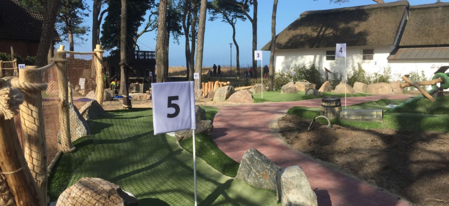 Seit über 35 Jahren ist die Minigolfanlage im Besitz einer Familie, die sie mit großem Erfolg betreibt. Vor kurzem ging die Verantwortung auf die nächste Generation der Familie über, die sich für einen Ausbau der Anlage entschied: von einer herkömmlichen, ebenen Minigolfbahn aus Beton zu einer kreativ von einem Thema inspirierten Adventure-Golf-Anlage mit auf- und abführenden, geschwungenen Spielflächen aus hochwertigem Kunstrasen in unterschiedlichen Sorten und Farben. Das Ergebnis ist eine einzigartige und moderne Crazy-Golf-Anlage mit hohem Spaßfaktor, bei der sich alles um das Thema 'Piraten' dreht, eingebettet in eine maritime Umgebung, die Spannung und Herausforderung auf Schritt und Tritt bietet.