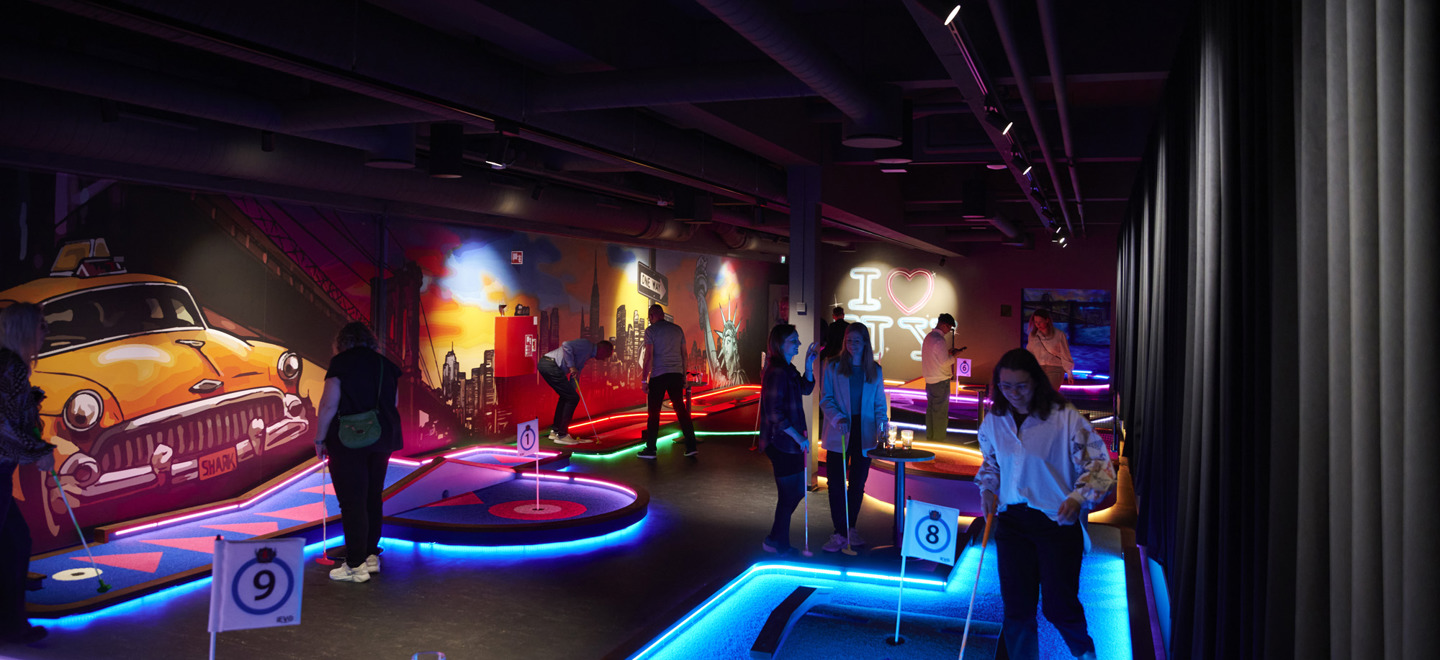 Putt EVO expands the genre of indoor minigolf attractions and take the crowd favourite to a new level. The special and innovative feature of Putt EVO is not only the modern design of the minigolf courses, but above all the various built in lightning effects and features.