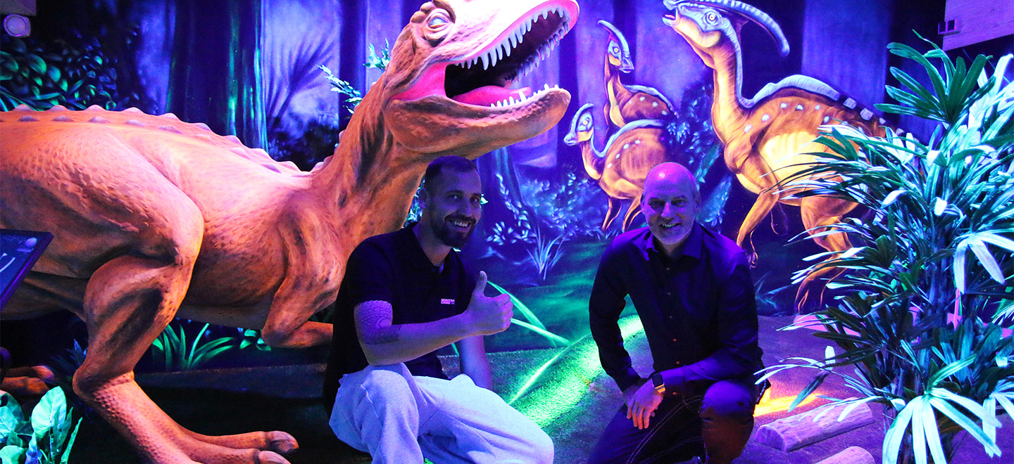 In nur 4 Monaten wurde ein neues Geschoss in die Halle eingebaut und alle Attraktionen spielbereit fertiggestellt. Das ist die erste 18 Loch Schwarzlicht Adventure Golf Anlage mit fotorealistischer Schwarzlicht Bemalung in Europa. Die Graffiti-Bemalung wurde in Zusammenarbeit mit dem für City Golf Europe exklusiven Künstler Costwo Marcel Graf entwickelt und realisiert. Das Design wurde dabei so aufgebaut, dass es sowohl unter Schwarzlicht als auch unter normalen Licht bespielt werden kann. Und dass ohne „störende“ 3D Brille. Reale Figuren, Pflanzen und die Bemalung sorgen für ein verschwimmen der Dimensionen. 4 verscheiden Welten lassen den Spieler durch eine faszinierende Eiswelt gehen, eintauchen in die aufregende Unterwasserwelt mit dem einzigartigen Kraken, in einen urzeitlichen Dschungel voller gefährlicher Dinosaurier wandeln, um schliesslich durch die brennende Hitze der Wüste in eine Oase zu gelangen. Begeben Sie sich auf die Reise durch die Klimazonen der Erde in Husum. Wir wünschen Timo und seinem Team einen großartigen Erfolg mit dieser einzigartigen Freizeit-Unterhaltung für Gross und Klein entworfen und gebaut von City Golf Europe.