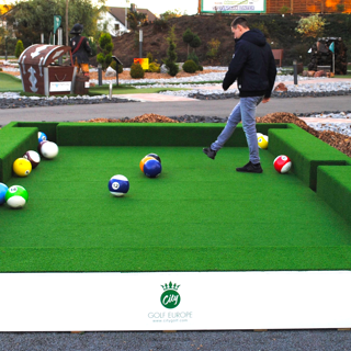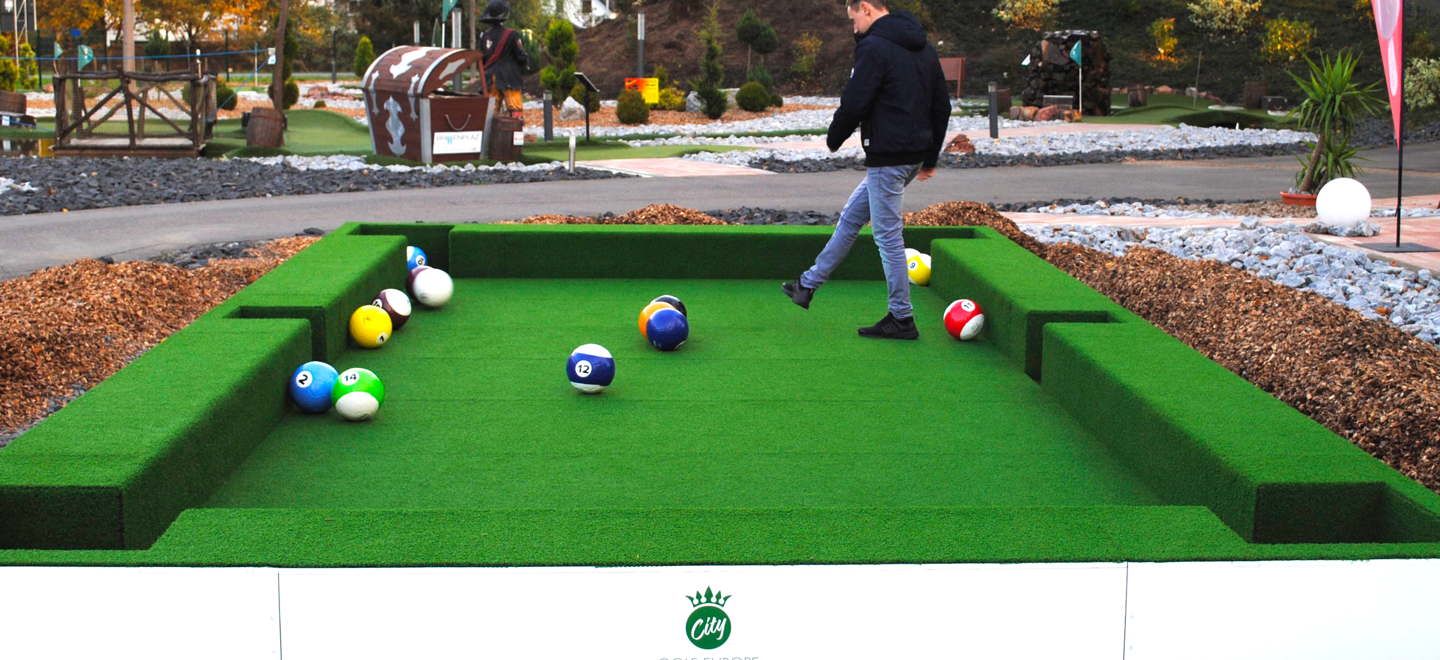 Fußball-Billard wird auf einem übergroßen Billardtisch (4 m x 7 m) mit speziellen Fußbällen gespielt, die sehr ähnlich aussehen wie echte Billardkugeln. Es gibt wie beim Billard 7 Halbe, 7 Volle und eine schwarze Acht sowie einen weißen Spielball. Niemand muss ein Fußballtalent sein, um dieses Spiel zu spielen; hier geht es nur um Taktik, Präzision und viel Spielspaß!